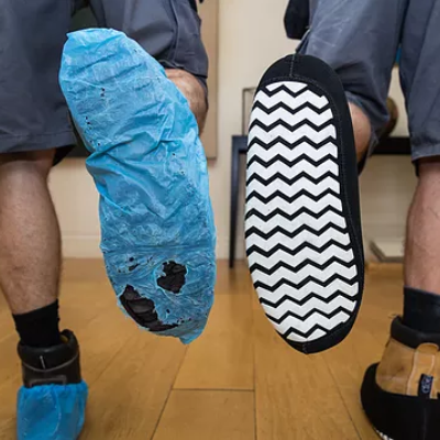 Answer: Single-use plastics often lack effective grip and rely on actual footwear grip edges. The Original CleanBoot® features a unique carpet grip sole made of printed PU, similar to safety boot soles. This provides good grip on various surfaces, and the grip actually improves with wear.